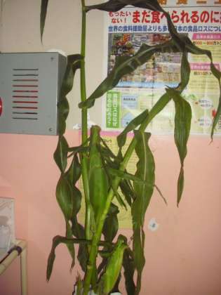 今日の給食にとうもろこしがでました。畑からとった後の状態の、くきや葉のついたとうもろこしが給食室前に飾ってありました。