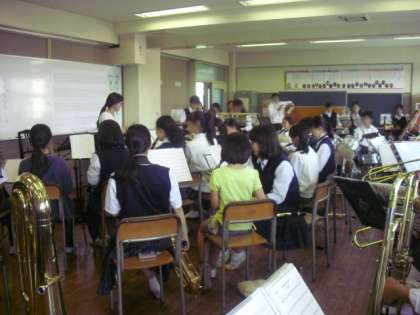 吹奏楽部では楽器をもたせてもらい、一緒に音出し、音合わせをしました。中学生の演奏も聴かせてもらいました。