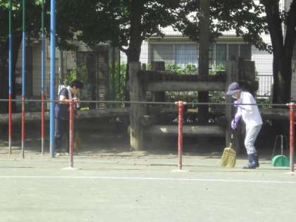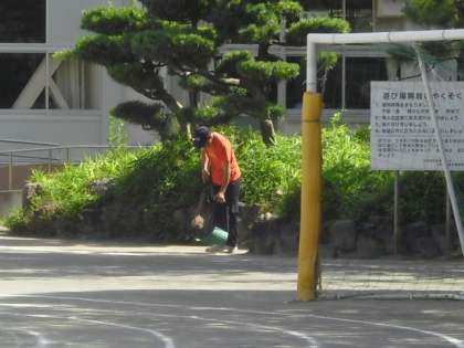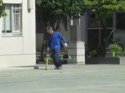主事さん方は、朝の子どもたちのお迎えを終えるとすぐに学校の清掃を始めてくださいます。今日も大汗をかきながら、校庭を掃いてくださっていました。いつもありがとうございます。主事さん方も頑張っています。