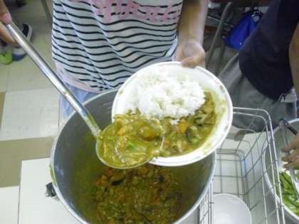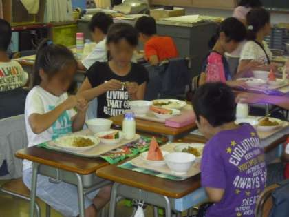 今日のメニューは、大好きな子どもたちが大勢いる「カレーライス」「枝豆」「スイカ」。1学期の間、子どもたちのために頑張ってくださった栄養士の先生、調理師の皆さんに感謝の気持ちを込めて「いただきます!!」。ありがとうございました。