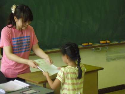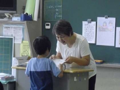 通知表は担任の先生から一人ひとりの子どもたちに手渡されます。先生方によって渡し方は違いますが、一人ひとりの努力を認め、励ましの言葉をかけているところは、どのクラスも同じです。