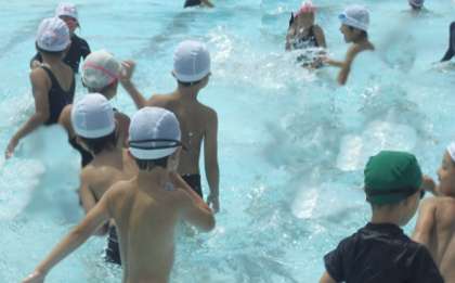 後半は、自分たちの力に合わせて、大きいプールと小さいプールに分かれて練習しました。小さいプールで練習しているお友達は、けのびが上手になってきました。「両手は、耳の後ろでしっかり伸ばす」 基本としてとても大切です。