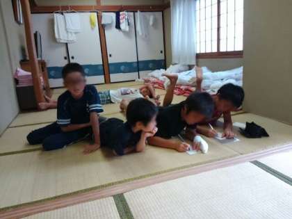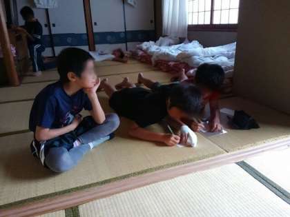 夕食前の男子のくつろぎタイムです。のんびりと寝転んだり、はがきを書いたりしていました。こういう時間も良いものです。