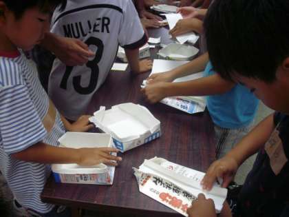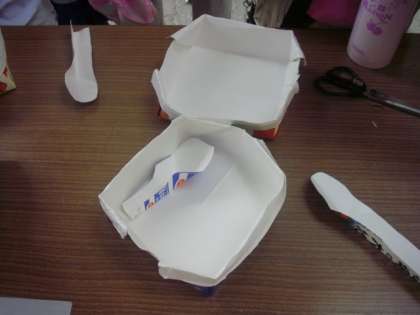受付のところでさっそく牛乳パックを使ったトレーとスプーンづくりに挑戦です。