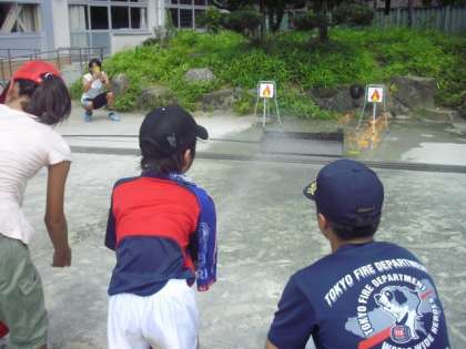まずは大きな声を出して人に知らせます。「火事だ!」これが大事です。水が届く範囲は約7m、みんななかなか上手です。