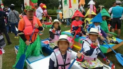 夏休み最後の日曜日、アドベンチャーin多摩川の開幕です。小学校が59艇、中学校なども合わせると、65艇の参加と大盛況です。