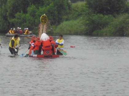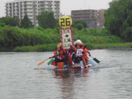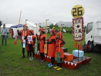 玉堤風林火山(26)が見えてきました。最後まで、息を合わせて一生懸命漕いでいます。コスチュームがとても目立っています。