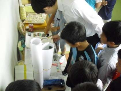 休み時間には、お友達の自由研究を鑑賞していました。新任の小川先生も仲間に入っていました。