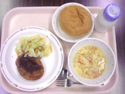 献立は、丸パン、かぼちゃコロッケ、キャベツソテー、トマトと卵のスープ、牛乳です。
