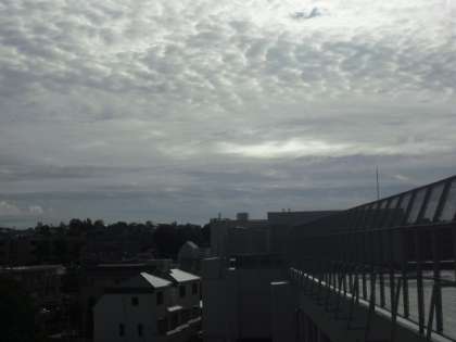 久しぶりに朝から青空が広がっていました。7時ころ屋上から東の空を見るとまだ雲が広がっていました。振り返って西の方を見ると、富士山がくっきりと見えました。とてもきれいでした。