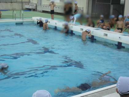 これが今年度の玉堤最後の水泳指導です。学期中は、別々の指導ですが、天気の関係で一緒に入りました。
