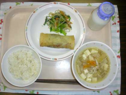 献立は、麦ごはん、春巻き、塩ナムル、豆腐の中華スープ、牛乳です。