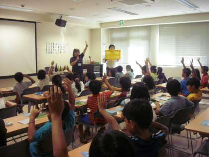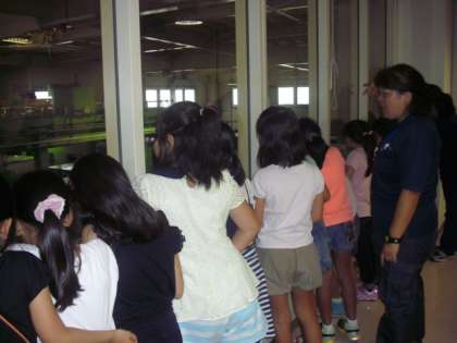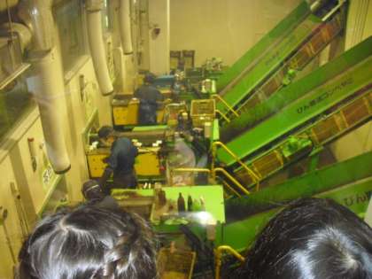 区内各地から集められたガラスびんがどのように仕分けされ、処理されるかについて説明をききました。