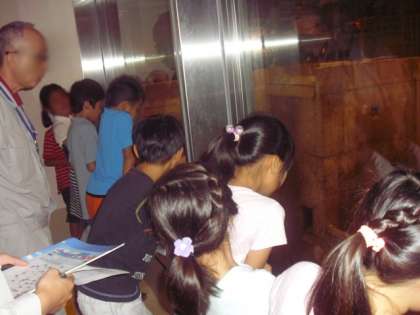 清掃工場は、あいにくボイラーが運転休止中でしたが、清掃車がごみバンカにごみを入れている様子を見学することができました。バンカの中にたくさんのゴミが入っているのを見てみんな目をまるくしていました。工場の仕組みをビデオで見た後、グループごとに施設を回り、説明を聞きました。たくさん質問もできました。