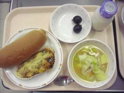 献立は、黒糖コッペパン、なすミートグラタン、野菜スープ、巨峰、牛乳です。