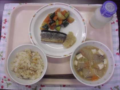 献立は、豆ごはん、さんまの塩焼き・大根おろし、野菜のごましょうゆ漬け、冬瓜のあんかけ汁、牛乳です。