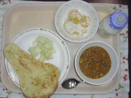 献立は、ナン、ひよこ豆のドライカレー、チーズ粉ふきいも、フルーツヨーグルト、牛乳です。