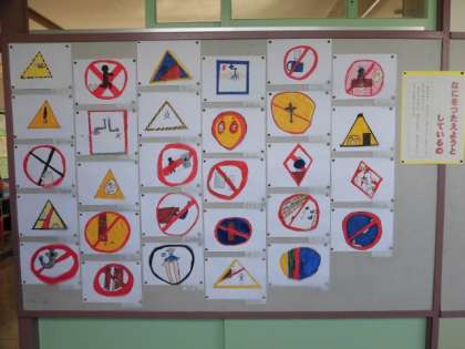 学校の中で、あるとよいと思う標識やマークを考えました。文字を使わずに、色や形で、目立つように工夫していました。また、伝えたい人を意識してつくることは、国語の学習の中でも大事なことです。