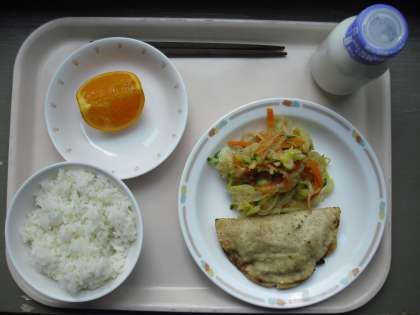 今日の献立:「ごはん・牛乳・ジャンボぎょうざ・こんにゃくサラダ・果物(せとか)」