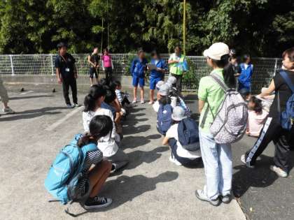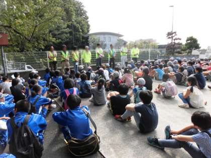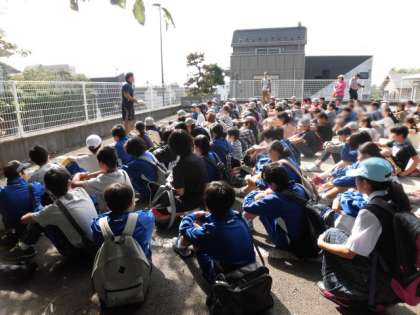 晴天の中、尾山台小の1クラス、尾山台中のボランティアの生徒さん・等々力渓谷保存会の方々とあいさつしてこれから渓谷に出発です。