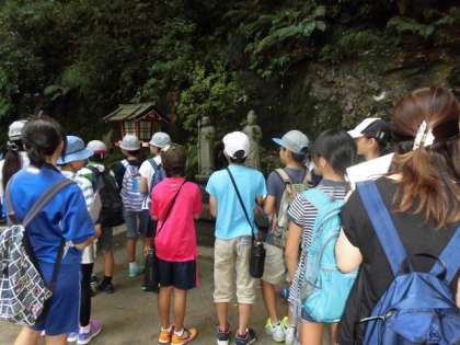 6つのグループに分かれ、中学生の案内で清掃活動を行いながら渓谷の主な場所を調べていきます。主要ポイントには別の中学生が待機していて説明をしてくれます。ところどころで保存会の方々からも内容を補足していただいたり、昔の話を聞かせていただいたりして内容の深いものとなりました。