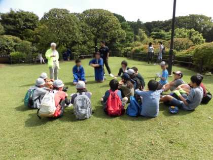 活動を終えて日本庭園に集まりました。グループごとにまとまってしばし歓談タイムです。中学生からは部活や中学校生活についていろいろな話を聞かせてもらいました。