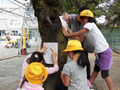 樹皮のざらざらした感触や「葉っぱのレントゲン」で葉を写し取ったりすることで自然に触れ、感じることができました。子どもたちは、模様のようになったり、きれいに葉を写し取ったりすることができて、大喜びでした。
