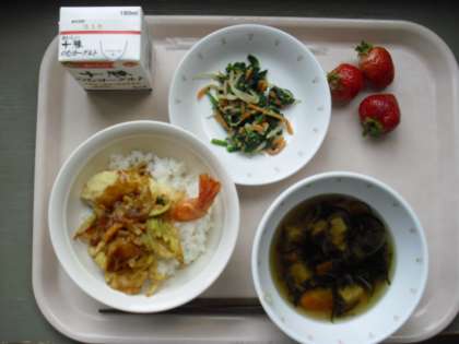 今日は、今年度最後の給食です。6年生にとっては小学校最後の給食でもあります。そこで、6年生の卒業をお祝いした献立になりました。天丼の「えび」、デザートの「イチゴ」は赤、飲み物の「ヨーグルトドリンク」は白と、紅白で卒業のお祝いを表しました。6年生にとっても、他学年のみなさんにとっても思い出に残る給食となったことでしょう。給食調理のみなさん、1年間美味しい給食をありがとうございました。
