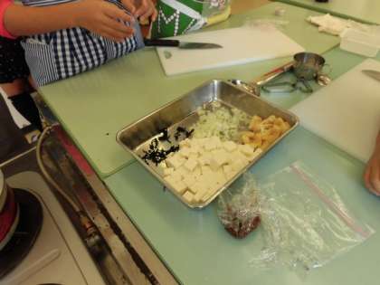 だいこんはいちょう切り、とうふは角切り、油揚げは短冊に切ります。いろいろな切り方ができるようになりました。グループの協力も上手です。おいしくて具だくさんの味噌汁ができました。