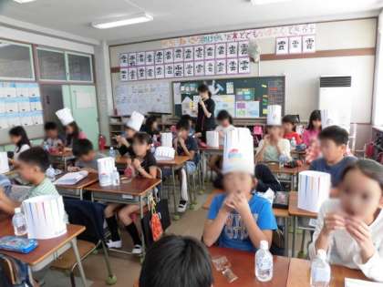 4年1組にはケーキスタジオ グランクールの柴川先生が来てくださいました。味の基本5味を学び、それぞれの食材をよく味わいます。塩味、甘味、苦味を感じるよう、先生がチーズのクッキーとビターチョコのクッキーを持参してくれました。