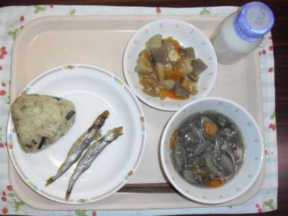 献立は、きのこと山菜のおにぎり、焼きししゃも、里芋と生揚げのうま煮、大根汁、牛乳です。