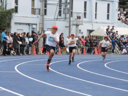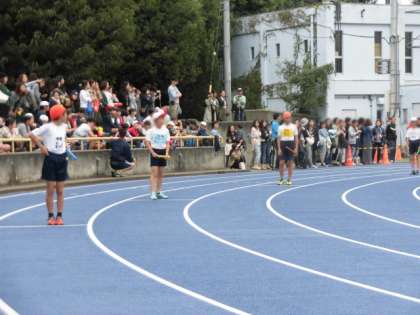 午前と午後の競技の間に男女別400mリレーがありました。第一走者はみんなの座席のちょうど目の前でした。「がんばれ!」手を振りながら大声援です。