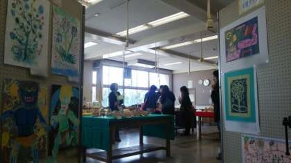 (2枚目の写真は、日本文化部の「華道・茶道」、3枚目は小学生の作品)