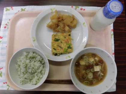 献立は、しらすと青のりのごはん、切干大根入り卵焼き、じゃがいもの甘辛煮、なめこのみそ汁、牛乳です。