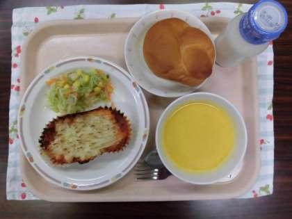 献立は、ミルクパン、シェパーズパイ、コールスローサラダ、かぼちゃのポタージュ、牛乳です。