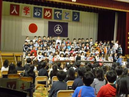 入学式の中で、6年生の歓迎の言葉や、2年生の合奏など、最上級生の6年生は、他の学年の思いを伝えていました。その後、暖かい春の日差しがさす校庭で、満開の桜の花の下で記念写真を撮り、新1年生は、笑顔で保護者の方と戻られていました。