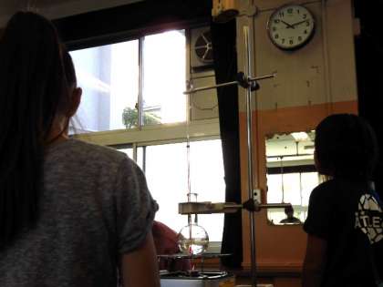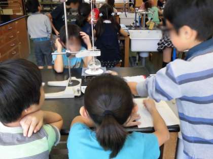 4年生のもう一クラスも初めて火を使った実験をしました。フラスコ内の水の変化を時間を追って丁寧に観察し、記録していきました。