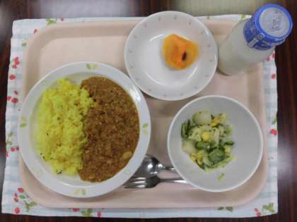 献立は、イエローライス、大豆入りキーマカレー、ポテト入りフレンチサラダ、園芸高校の柿、牛乳です。
