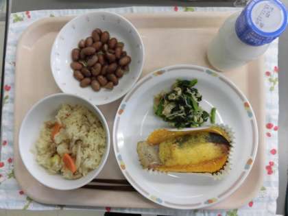 献立は、吹き寄せごはん、さけの紅葉焼き、小松菜の煮びたし、煮豆、牛乳です。