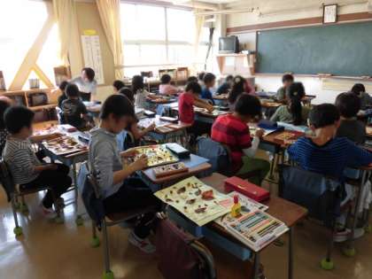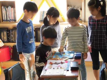 落ち葉やどんぐりを使って一人ひとりの思いを画用紙に表現しています。
