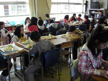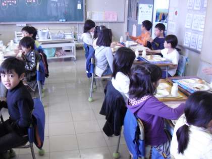 担任教師の指導の下、給食の配膳から始まり、準備をします。白衣を着てバランス良く配膳するのは、中学年でもなかなか大変です。いよいよ、「いただきます」の合図で食べ始めます。子どもたちは、「おいしいよ」と答えてくれました。好き嫌いなく食べてくれるようになって欲しいものです。