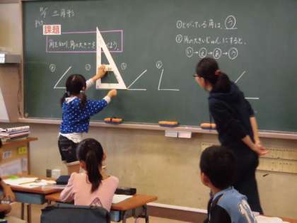 6日(金)の研究発表会の日に続いて「三角形」の学習に取り組んでいました。今日は、「角を知り、角を調べる」学習です。