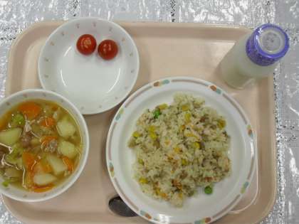 今日のメニューは「鶏ごぼうピラフ、白いんげんのスープ、ミニトマト、牛乳」でした。寒い日なので、スープで体が温まりました。ピラフも美味しかったようで、お代わりをする子どもも多くいました。