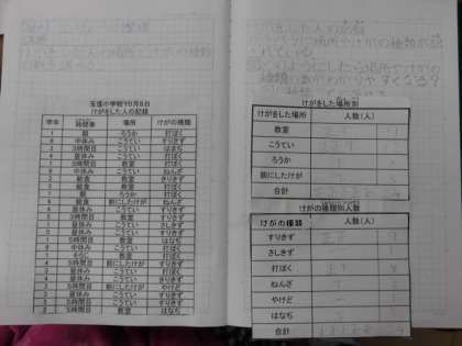 「しりょうの整理」の1時間目で、表の整理を学習しました。導入として、10月8日に学校でけがをしたお友達の実際の記録を基に学習をすすめました。