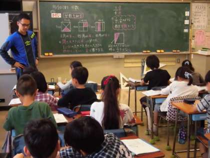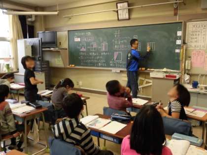 「同じ大きさに4こに分けた1こ分の大きさを、もとの大きさの四分の1といい、1/4と書きます」と初めて分数に出会いました。ノートに丁寧に正方形を書き、それを4等分しながら分数について学習していきました。同じ大きさに分けられていることが大切なことにも気付きました。