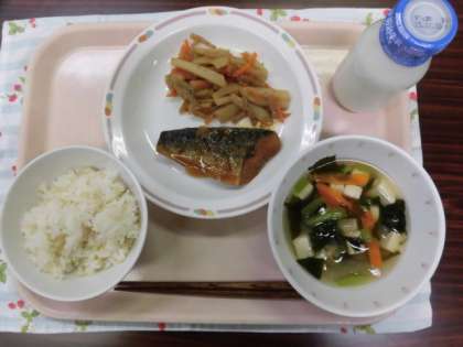 献立は、玄米入りごはん、さばのみそ煮、れんこんのきんぴら、すまし汁、牛乳です。