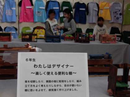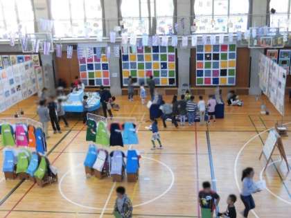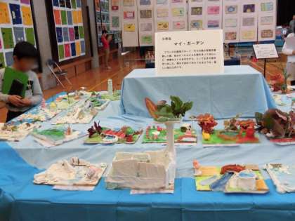 5年生の作品や、鑑賞の様子、他学年が5年生の作品を鑑賞している様子です。