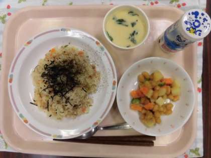 献立は、豚ときのこのちらしずし、大豆のコロコロサラダ、ラッキー茶碗蒸し、ジョアです。