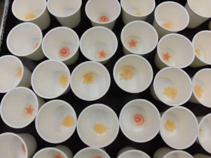 ラッキー茶碗蒸しは、3種類のなるとをランダムに入れました。二重丸:勉強ラッキー、星:運動ラッキー、もみじ:芸術ラッキーです。どのラッキーがあたるかは、食べてみてのお楽しみです。