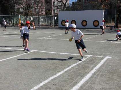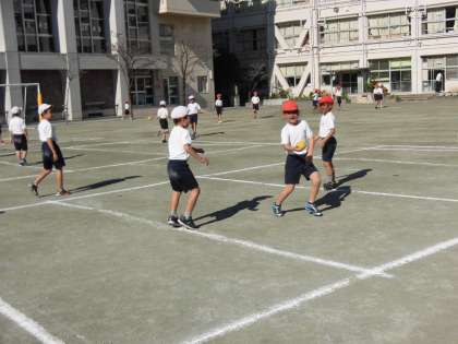 遊具を使った運動、キャッチボール運動、ボールを使ったゲームと3コーナーに分かれ時間で交代しながら楽しく体育をしました。